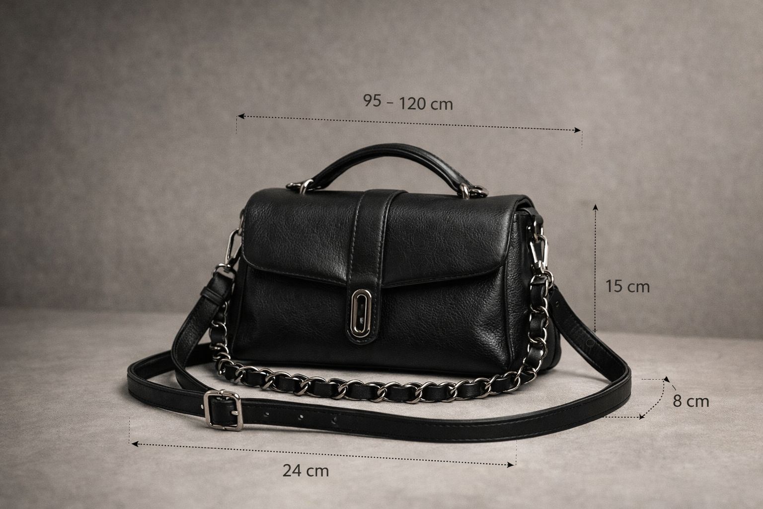 Ayarlanabilir askısıyla omuzda dengeli, zincir detayıyla sade ama özenli.